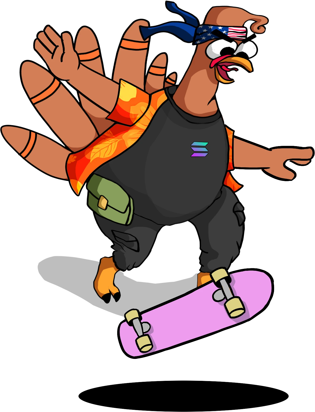 Gobbly is here to gobble the Thanksgiving culture on the Solana. Gobbly's adventures are endless, from dodging the dinner table to leading internet challenges. He's the life of the digital party, always ready to crack a joke.